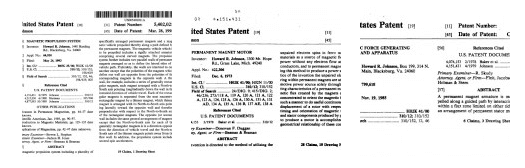 Bilder der 3 US Patente für den „Magnet Motor“ sind unten aufgezeigt.